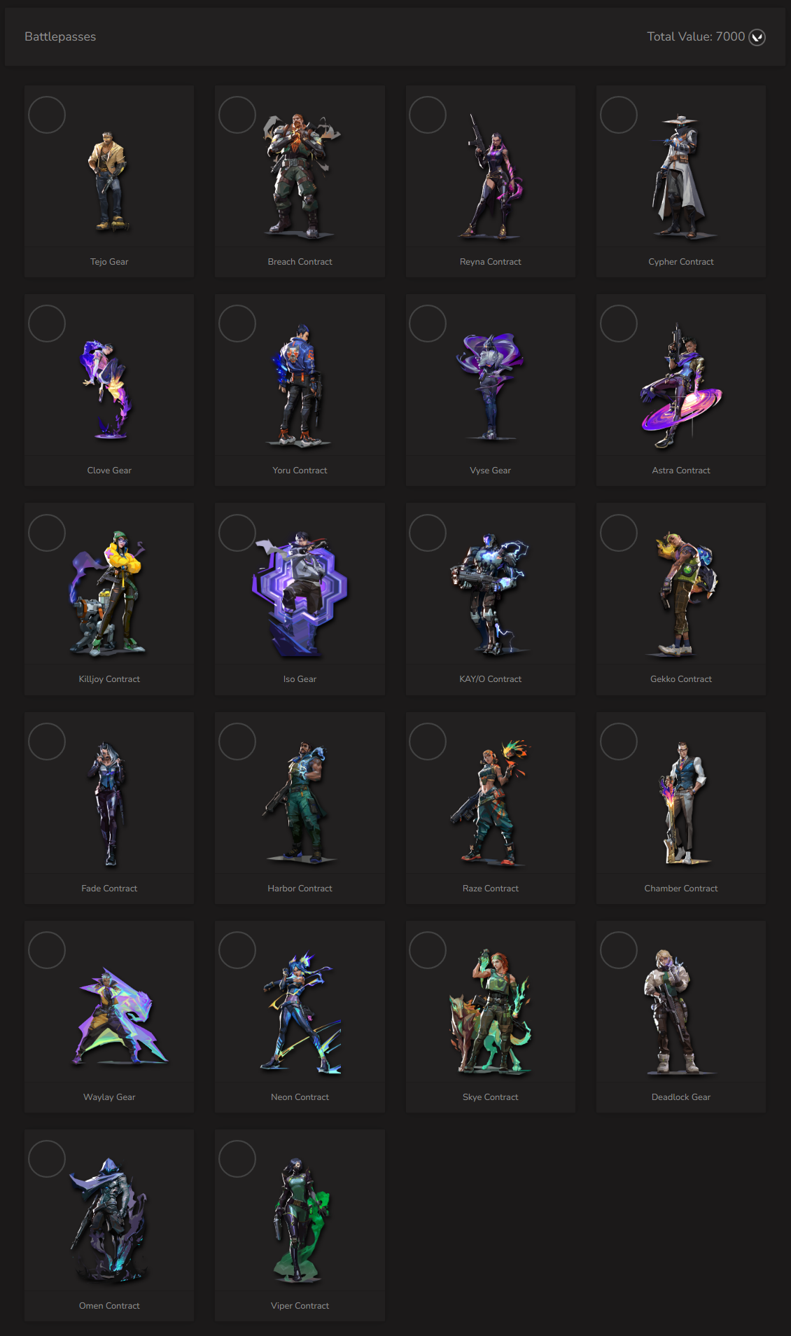 ✴️ Agents (22) Skins (51) Gun Buddies (269) Sprays (149) Cards (201) Titles (146)